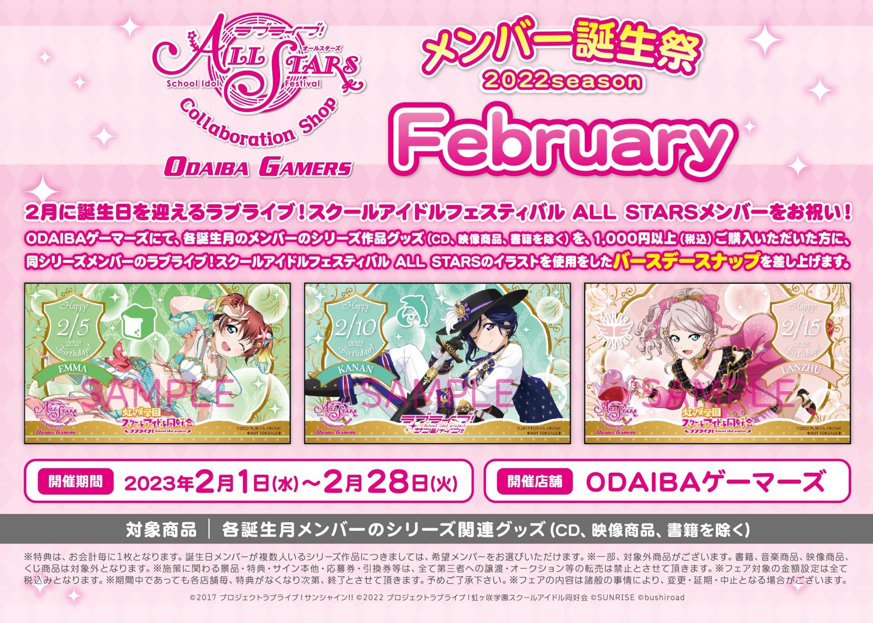 期間中、ODAIBAゲーマーズにて、各誕生月のメンバーのシリーズ作品グッズ(CD、映像商品、書籍を除く)を、1,000円以上(税込)ご購入いただいた方に同シリーズメンバーのラブライブ!スクールアイドルフェスティバル ALL STARSのイラストを使用したバースデースナップを差し上げます。