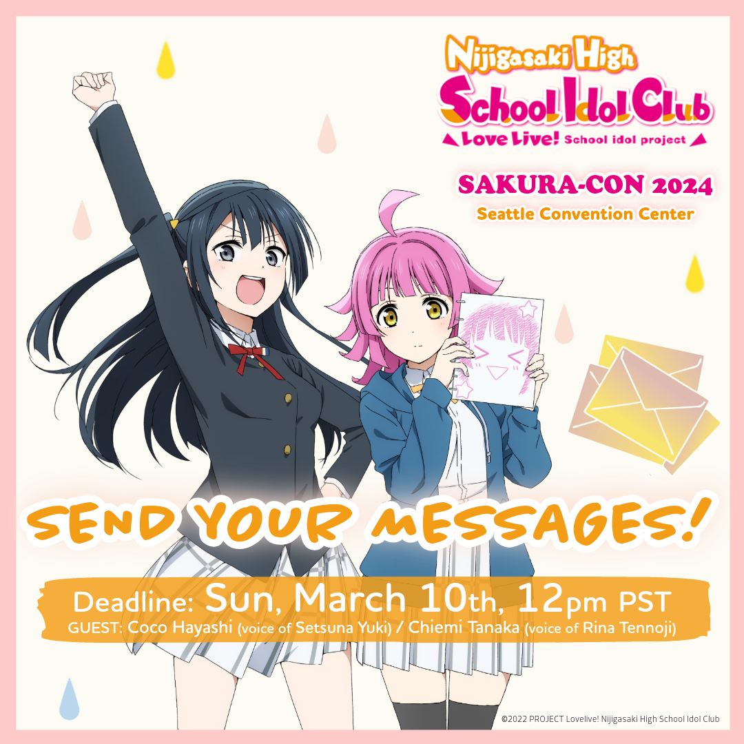 Bandai Namco Filmworks presents the special events of Love Live! Nijigasaki High School Idol Club featuring special guests, Coco Hayashi (voice of Setsuna Yuki) and Chiemi Tanaka (voice of Rina Tennoji) at Sakura-Con 2024!