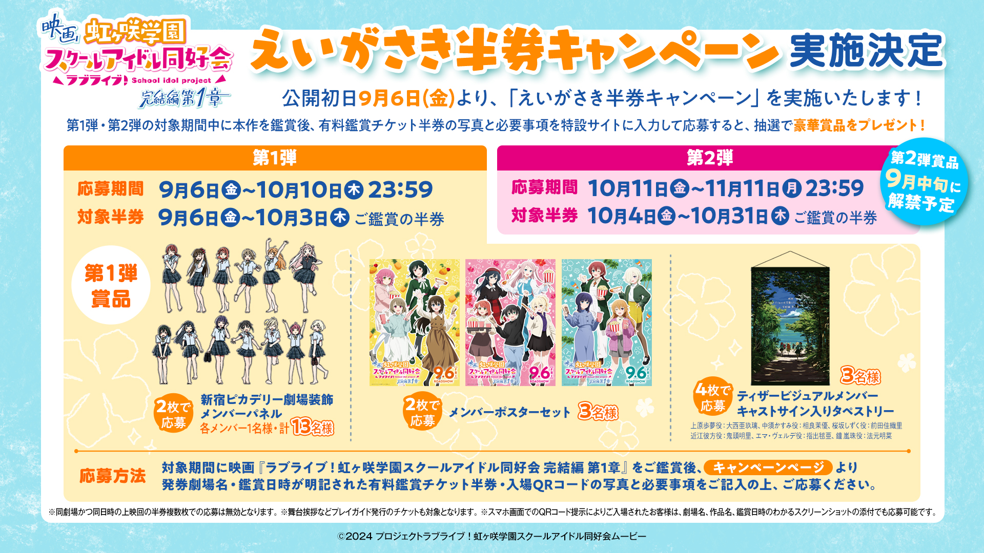 対象期間に映画『ラブライブ!虹ヶ咲学園スクールアイドル同好会 完結編 第1章』をご鑑賞後、キャンペーンページより発券劇場名・鑑賞日時が明記された有料鑑賞チケット半券・入場QRコードの写真と必要事項をご記入の上、ご応募ください。