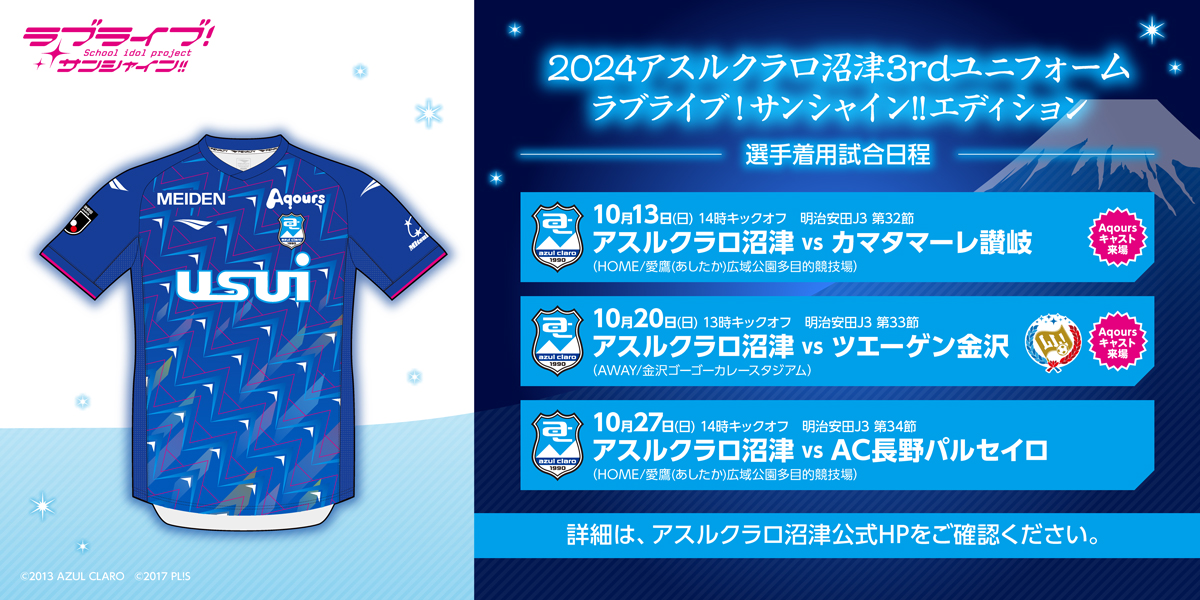 また、コラボユニフォーム「2024アスルクラロ沼津 3rdユニフォーム ラブライブ!サンシャイン!!エディション」について、2次受注が決定しました!