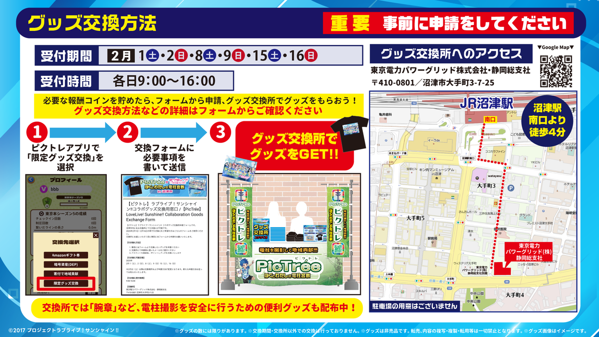 グッズ交換は東京電力パワーグリッド沼津総支社前のテントで、日程を限定して交換を受け付けます(交換可能日は以下をご確認ください)。