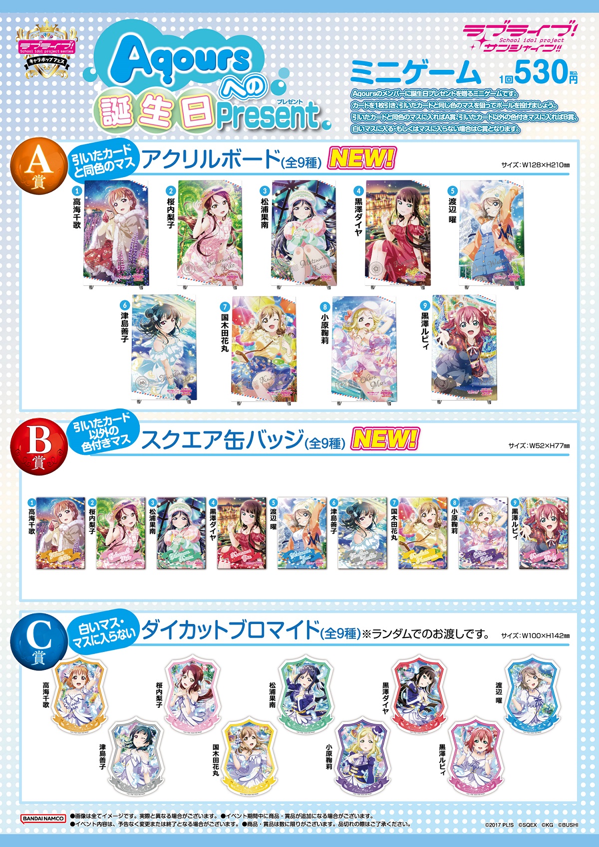 「ラブライブ!キャラポップフェス」のAqoursのミニゲームに新グッズが登場、5月21日(土)よりアトレ秋葉原店・キャナルシティ博多店にて取り扱いを開始します。